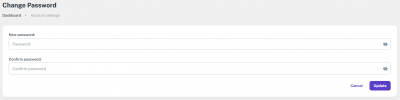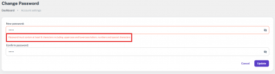 Once both rules are fulfilled — the password meets all validation criteria and both password fields match — simply click the Update button to successfully change the password. If the user wishes to cancel the process at any time, they can click the Cancel button to exit the User Management section.