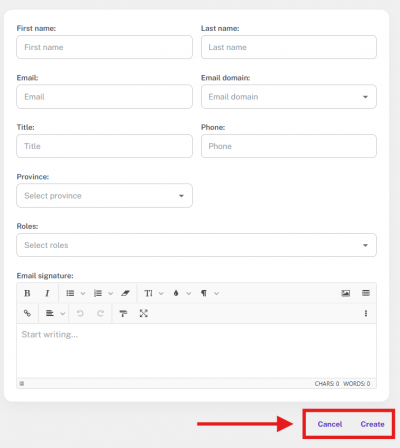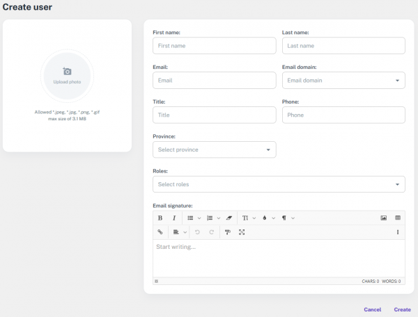 At the end of the form, there are two options: Cancel and Create. If you click Cancel, the form will close immediately, and you'll be taken back to the main User Management screen without saving any information. If you click Create, the system will process the entered details, and a new user will be successfully created based on the provided information.
