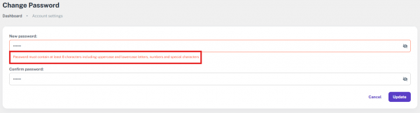 Once both rules are fulfilled — the password meets all validation criteria and both password fields match — click the Update button to change the password successfully. If the user wishes to cancel the process at any time, they can click the Cancel button to exit the User Management section.