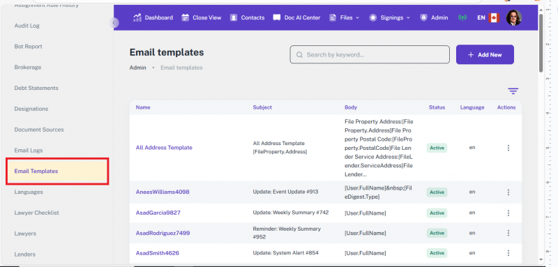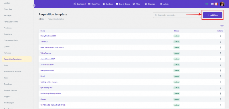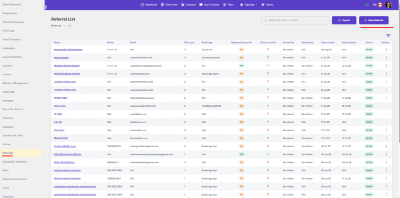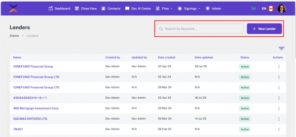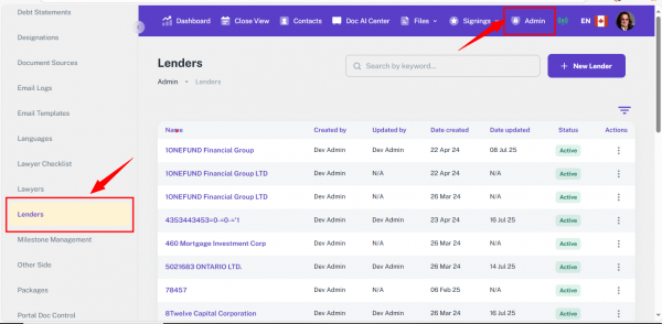 The Lenders module in the Admin Panel allows you to manage all lender-related records used throughout the platform. These records are referenced during file creation, document generation, communication, and other automated processes. This section supports detailed lender information, including contacts, discharge, and payout details.