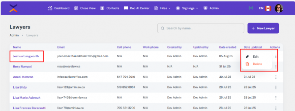 • Edit: Update the details using the same form as when adding a lawyer.