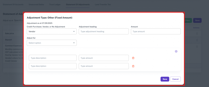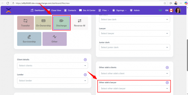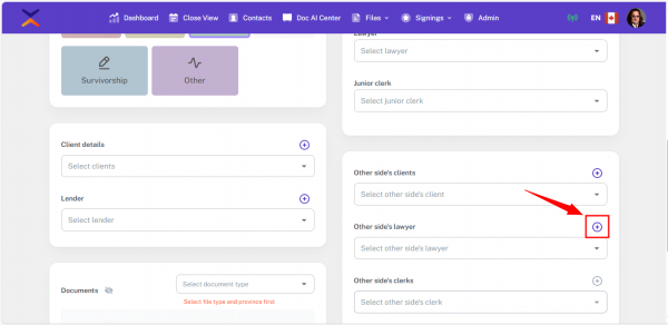 • Once a supported type is selected, the Lawyer and Clerk fields will appear under the End/Other Side Client section.