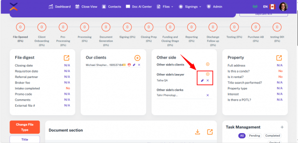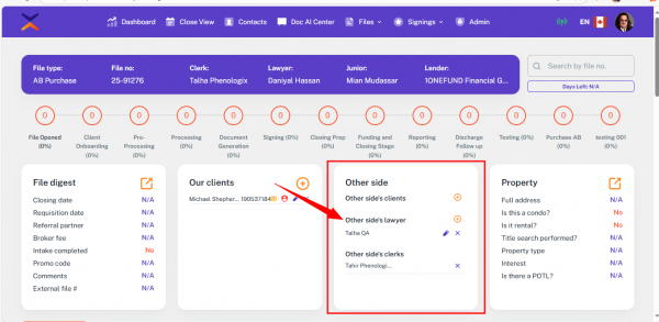 • After saving the file, the selected lawyer will appear in the Other Side card of the file.