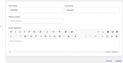 In this section, you have the option to update your first name, last name, phone number, and email signature. You can click on any text field to edit the information. Once you're done, click the Update button to save the changes. At any time, you can also cancel the process and exit the profile management section by clicking the Cancel button.