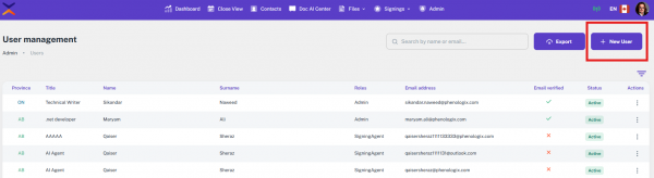 In the User Management module, the admin has the authority to add new users to the system. This functionality is provided through the “New User” button located at the top right corner of the page.